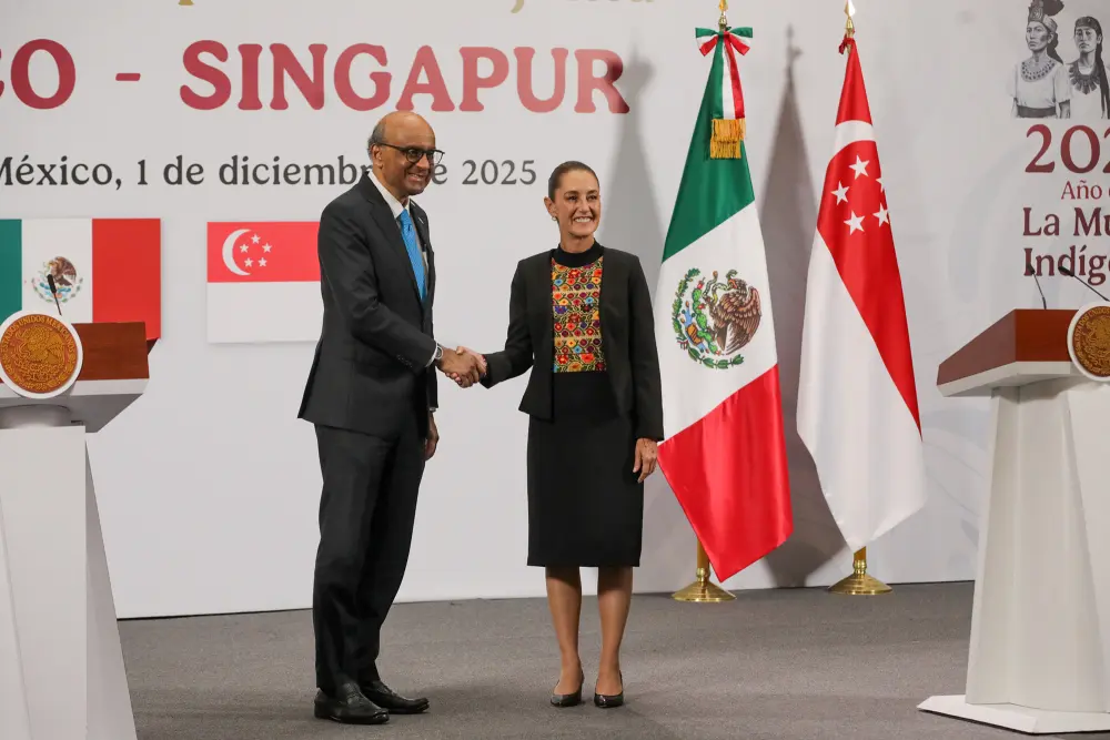 Sheinbaum conversa con el presidente de Singapur sobre oportunidades y retos económicosLa presidenta de México, Claudia Sheinbaum, recibió en Palacio Nacional al presidente de Singapur, Tharman Shnmugaratnam para conversar sobre diversas oportunidades que permitan enfrentar desafíos globales.”Entre ambas naciones existe colaboración, hermandad, acuerdos e inversión”, comentó la mandataria federal a través de un mensaje publicado en su cuenta de la red social X.